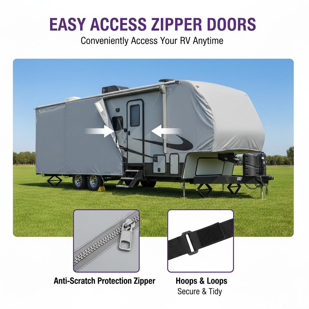 •Convenient Access & Ventilation: Equipped with four strategically placed air vents to minimize wind lofting and moisture. Rollable, zippered panels allow easy access to your RV's doors and storage compartments without removing the entire cover.